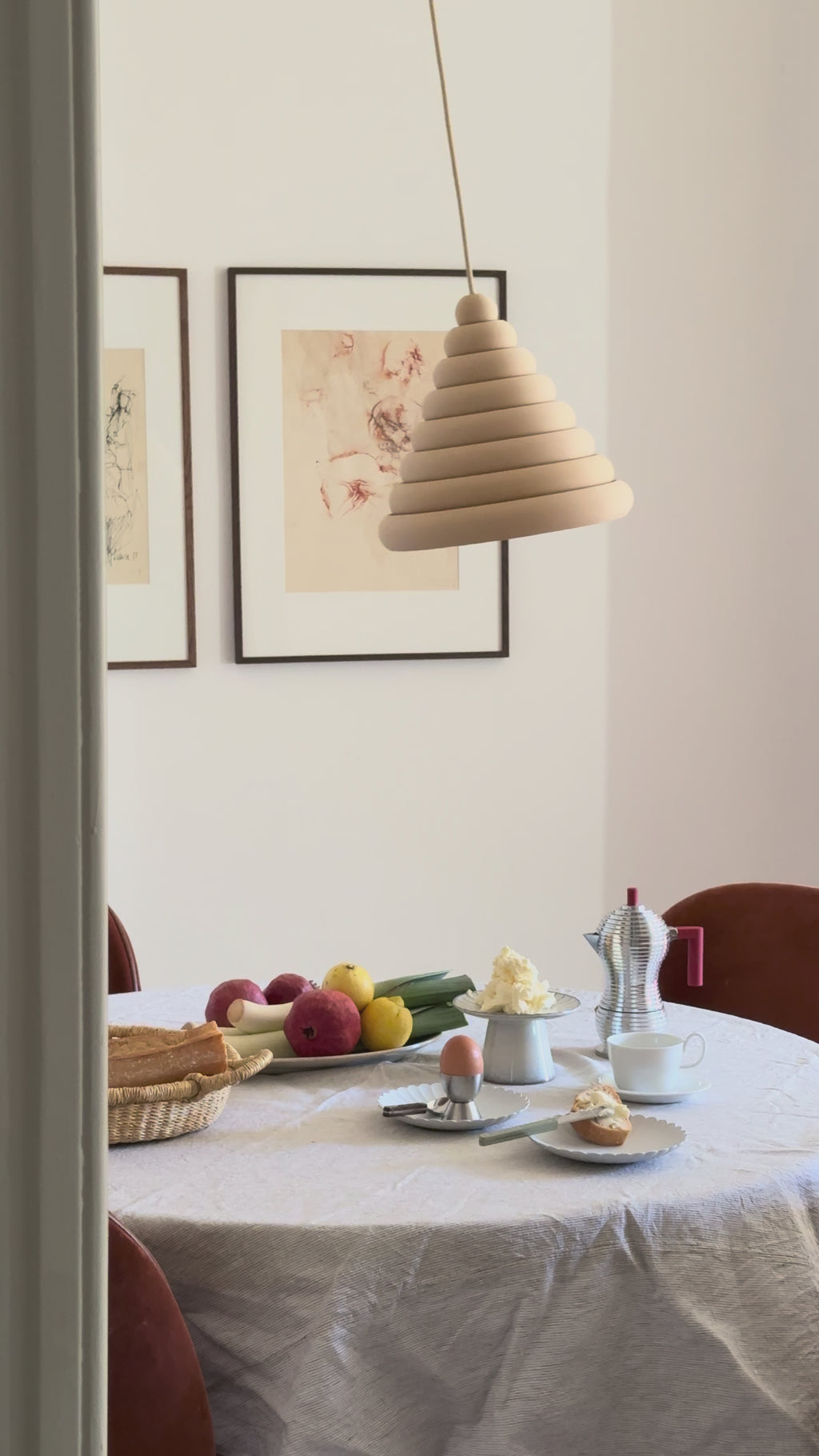 Its sculptural form draws inspiration from one of the earliest known geometric shapes used in ancient civilizations, the circle. The round form has been a recurring theme in architecture, particularly with its association with perfection and harmony, as seen in structures like the Guggenheim Museum. The lamp offers a tactile organic feel and emits a soft warm glow.